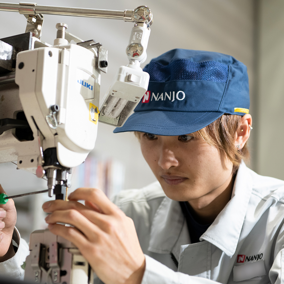 オリジナルミシンの高い性能を存分に引き出すため、縫製オペレーターの技術も、さらに磨き込みました。仕上がり品質の良さで高評価をいただいているNANJOの縫製技術。